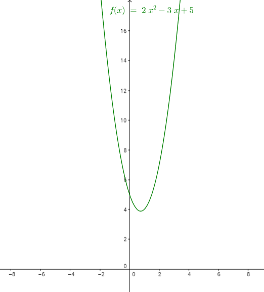 $$\begin{align}&f(x)=2x^2-3x+5\\&Ceros:\\&x_{1,2}=\frac{3 \pm \sqrt{(-3)^2-4 \cdot 2 \cdot 5}}{2\cdot2}=\frac{3 \pm \sqrt{-31}}{4}\\&x_1=\frac{3}{4} + i \frac{\sqrt{31}}{4}\approx 0.75 + i \ 1.391941\\&x_2=\frac{3}{4} - i \frac{\sqrt{31}}{4}\approx 0.75 - i \ 1.391941\\&\text{Las coordenadas del vértice están en el valor de x que es el promedio de las raíces o en punto x= b/2a}\\&x_{vertice}=\frac{x_1+x_2}{2}=\frac{\frac{3}{4} + i \frac{\sqrt{31}}{4}+\frac{3}{4} - i \frac{\sqrt{31}}{4}}{2}=\frac{3}{4}=0.75\\&y_{vertice}=\\&f(x_{vertice})=f(0.75)=2 \cdot (0.75)^2-3\cdot0.75+5=3.875\\&\text{Eje de simetría: } x=0.75\\& Crecimiento/Decrecimiento:\\&\text{es un polinomio cuyo coeficiente "a" es positivo, así que tiene las ramas hacia arriba, por lo tanto decrecerá }\\&\text{hasta el vértice y luego crecerá}\\&Crecimiento: (0.75, +\infty)\\&Decrecimiento: (-\infty, 0.75)\\&\text{No preguntás por los intervalos de positividad y negatividad, pero veamos}\\&Positividad: \text{Vimos que las raices son complejas y en el vértice es positiva, así que la función es positiva para todo R}\\&Negatividad: \text{Por lo mismo que antes, = } \emptyset\\&\end{align}$$