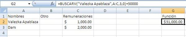 Utilice la función BuscarV para encontrar la remuneración de Valezka Apablaza y añada un bono de 50000