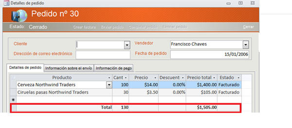 Tengo una consulta estoy armando una base de datos en base al ejemplo incorporado en access de la base Neptuno ( northwind ) y en el formulario detalles de pedidos en su subformulario quiero replicar que me aparezca el total de la columna