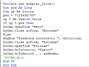 El la Bd que tengo al abrir se habré un formulario donde pide una contraseña para poder entrar en la Bd el codigo es el siguiente.