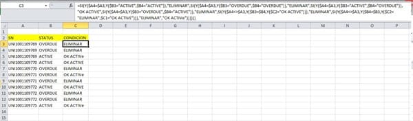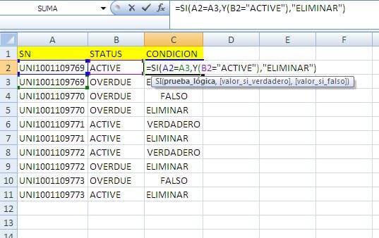 y esta condicion =SI(A2=A3,Y(B2="ACTIVE"),"ELIMINAR")