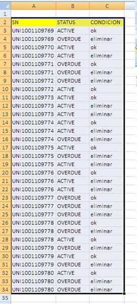 Sub ActiveOverdue() 'Por.Dante Amor c = "A" ant = Cells(3, "A") k = 1 u = Range("A" & Rows.Count).End(xlUp).Row Range("C3:C" & u).ClearContents ' n = 0 ini = 3 For i = 3 To u + 1 If ant = Cells(i, "A") Then n = n + 1 fin = i a = Cells(ini, "B") b = Cells(ini + 1, "B") c = Cells(ini + 2, "B") Else Call combinacion(ini, fin, n, a, b, c) n = 1 ini = i fin = i End If ant = Cells(i, "A") Next MsgBox "Proceso Terminado", vbInformation, "NUMERACIÓN" End Sub ' Sub combinacion(ini, fin, n, a, b, c) 'Por.Dante Amor If n = 2 Then If a = "ACTIVE" And b = "OVERDUE" Then Cells(ini, "C") = "ok" Cells(fin, "C") = "eliminar" End If If a = "ACTIVE" And b = "ACTIVE" Then Cells(ini, "C") = "ok" Cells(fin, "C") = "eliminar" End If If a = "OVERDUE" And b = "OVERDUE" Then Cells(ini, "C") = "ok" Cells(fin, "C") = "eliminar" End If If a = "OVERDUE" And b = "ACTIVE" Then Cells(ini, "C") = "eliminar" Cells(fin, "C") = "ok" End If Else If a = "ACTIVE" And b = "ACTIVE" And c = "ACTIVE" Then Cells(ini, "C") = "ok" Cells(ini + 1, "C") = "eliminar" Cells(fin, "C") = "eliminar" End If If a = "ACTIVE" And b = "ACTIVE" And c = "OVERDUE" Then Cells(ini, "C") = "ok" Cells(ini + 1, "C") = "eliminar" Cells(fin, "C") = "eliminar" End If If a = "ACTIVE" And b = "OVERDUE" And c = "ACTIVE" Then Cells(ini, "C") = "ok" Cells(ini + 1, "C") = "eliminar" Cells(fin, "C") = "eliminar" End If If a = "OVERDUE" And b = "ACTIVE" And c = "ACTIVE" Then Cells(ini, "C") = "ok" Cells(ini + 1, "C") = "eliminar" Cells(fin, "C") = "eliminar" End If If a = "OVERDUE" And b = "OVERDUE" And c = "OVERDUE" Then Cells(ini, "C") = "ok" Cells(ini + 1, "C") = "eliminar" Cells(fin, "C") = "eliminar" End If If a = "OVERDUE" And b = "OVERDUE" And c = "ACTIVE" Then Cells(ini, "C") = "ok" Cells(ini + 1, "C") = "eliminar" Cells(fin, "C") = "ok" End If If a = "OVERDUE" And b = "ACTIVE" And c = "OVERDUE" Then Cells(ini, "C") = "eliminar" Cells(ini + 1, "C") = "ok" Cells(fin, "C") = "eliminar" End If If a = "ACTIVE" And b = "OVERDUE" And c = "OVERDUE" Then Cells(ini, "C") = "ok" Cells(ini + 1, "C") = "eliminar" Cells(fin, "C") = "eliminar" End If End If End Sub