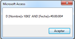 Private Sub cmdFiltrar_Click() Dim vNombre As String Dim vFecha As Date Dim vLargo As Integer Dim miFiltro As String 'Cogemos los valores que hayamos seleccionado como filtro vNombre = Nz(Me.cboNombre.Value, "") vFecha = Nz(Me.txtFecha.Value, 0) 'Inicilizamos el filtro miFiltro = "" 'Creamos la primera parte del filtro If vNombre <> "" Then miFiltro = "AND [Nombre]='" & vNombre & "'" End If 'Creamos la segunda parte del filtro If vFecha = 0 Then miFiltro = miFiltro & " AND [Fecha]=#" & vFecha & "#" End If vLargo = Len(miFiltro) If vLargo > 0 Then miFiltro = Right(miFiltro, vLargo - 2) End If MsgBox miFiltro 'Aplicamos el filtro al formulario Me.Filter = miFiltro Me.FilterOn = True End Sub