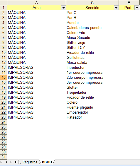 El problema es puntual, por ejemplo al desplegar la combobox de area me aparece tantas veces la palabra "MÁQUINA" como esta aparece en la hoja "BBDD". Necesito que solo aparezca UNA VEZ la palabra "MÁQUINA" a pesar de estar repetida.