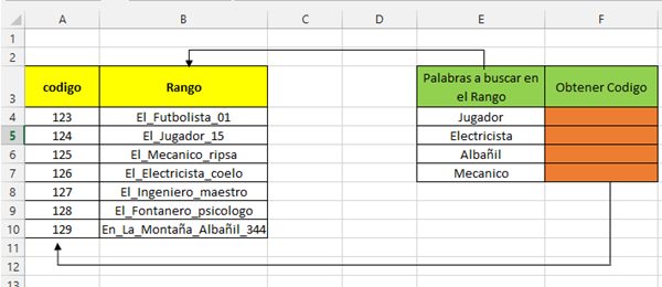 Deseo buscar o hallar una palabra dentro de un rango de celdas que contienen una frase. Una vez encontrado obtener el código que esta en la columna adjunta. Adjunto la Imagen: