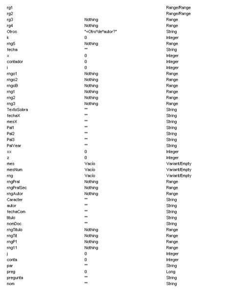 Pensaba que habría algún procedimento para conseguir algo tan elemental como una listado con todas las variables y propiedades utilizadas en una macro determinada. Debe de haber tal procedimiento porque en la ventana local sale tal listado, pero no lo deja copiar