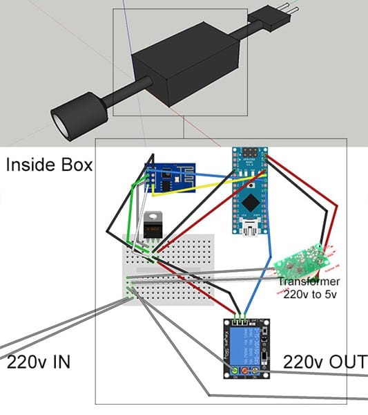 Lo quiero para alimentar desde una misma toma de corriente, una lámpara a través de un relé, y un Arduino que se encarga de controlar el relé, esto es lo que pretendo hacer: