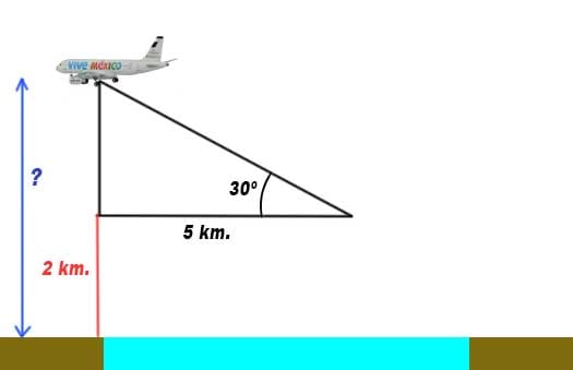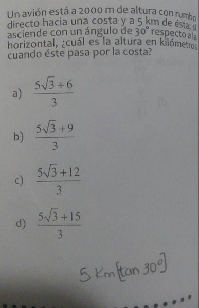 Un avión esta a 2000m de altura con rumbo directo hacia una costa y a 5km de éstas. Si asciende con un angulo de 30 ° respecto a la horizontal, ¿cuál es la altura en kilómetros cuando éste pasa por la costa? Por favor explíquenmelo