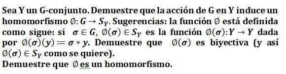 Sea Y un G-conjunto. Demuestre que la acción de G en Y induce un homomorfismo ∅:G→S_Y Sugerencias: la función ∅ está definida como sigue: