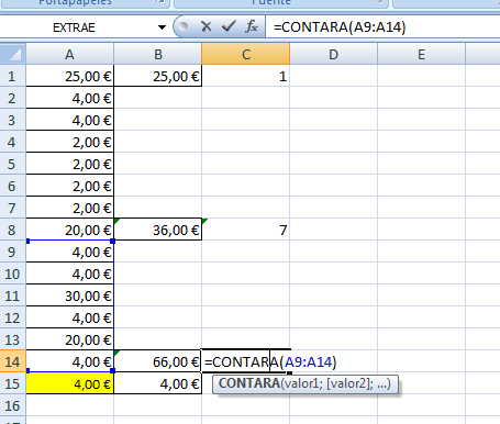 La fórmula de una celda es =suma(x:y) y la otra es contara(x:y).