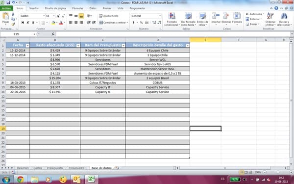 2.- En la hoja llamada Base de datos, tengo tres columnas llamadas "Gasto efectuado (US$); Item del Presupuesto; Descripción detalle del gasto." respectivamente.