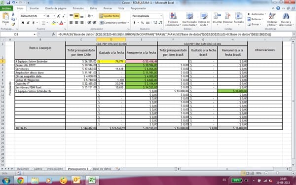 3.- En gastos efectuados están los valores numérico que debo sumar si es que corresponden al mismo "Item del presupuestos" pero si en "Descripción detalle del gasto." respectivamente" el texto que contiene termina o contiene la palabra Brasil no debe sumarlo.