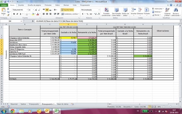 1.- En hoja "Presupuesto" tengo varias columnas una llamada Item o Concepto y otra llamada "Gastado a la fecha" desde la celda C3 en adelante, en está pongo en cada una los resultado de una suma.