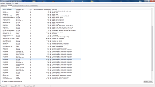 Hace varios dias he notado que cuando enciendo mi ordenador la CPU se mantiene funcionando casi al 100% durante media hora aproximadamente. Con el administrador de tareas he descubierto que el proceso svchost.exe se repite 15 veces y se come el 50% de la CPU. También Psanhost.exe suele ocupar el 30%. Esto no me había pasado nunca y me obliga a esperar a que todo vuelva a la normalidad para ejecutar cualquier otra aplicación. Adjunto pantallazo.