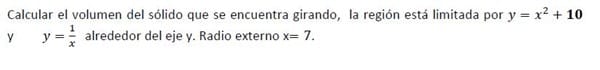 $$\begin{align}&Paso\ 3)\\&V = 2 \pi \int_{x_1}^{x_2} x[f(x)-g(x)] dx.................\text{sea f(x) > g(x)}\\&V = 2 \pi \int_{0.0999}^{7} x[x^2+10-1/x] dx=\\&2 \pi \int_{0.0999}^{7} x^3+10x-1\ dx=\\&2 \pi (\frac{x^4}{4}+5x^2-x)\bigg|_{0.0999}^{7}\end{align}$$y ya te queda resolver esa integral, que en principio no creo que tengas inconvenientes para eso.