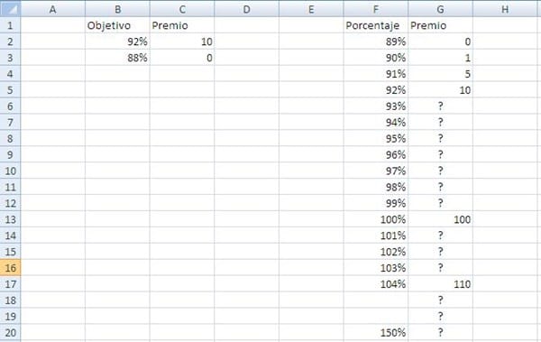 Tengo una tabla donde, si se logra el 90% del Objetivo, se percibe el 1% del premio.
