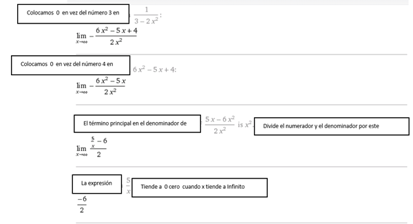 $$\begin{align}&\lim_{x \to \infty} \frac{6x^2-5x+4}{3-2x^2}\\&\text{Factor común x^2 en ambos polinomios}\\&\lim_{x \to \infty} \frac{x^2\cdot(6-5/x+4/x^2)}{x^2\cdot(3/x^2-2)}\\&\text{simplificando los }x^2, \text{lo que sobrevive que tien x tiende a cero y queda (haciendo abuso de notación):}\\&\lim_{x \to \infty} \frac{(6-0+0)}{(0-2)}=-3\\&\\&\end{align}$$