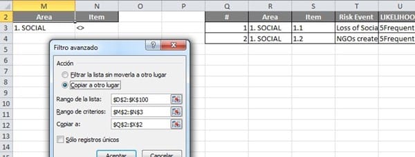 Luego selecciona alguna celda de la tabla de datos y desde menu Datos, Filtros Avanzados las opciones son las de la siguiente imagen: