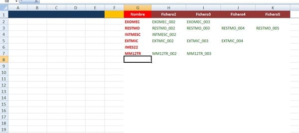 La columna G de mi hoja de excel contiene nombres base (sin extensión) de ficheros.