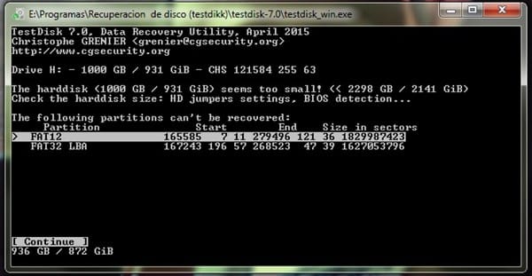 5 - Buscar la unidad donde están los datos a los que no se pueden acceder y seleccionar pulsando arriba de la misma. Luego, pulsar en continuar.