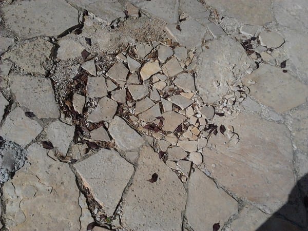 Pica el espacio de la piedra hasta llegar al hormigón, interesa saber, el grueso que disponemos para el mortero y el canto rodado. Has de picar a ras de la piedras de los lados. Principalmente usa el puntero, pues es el que más rompe. Si las vibraciones de un martillo eléctrico, no afectan a las piedras de los lados puedes usarlo, pero asegúrate.