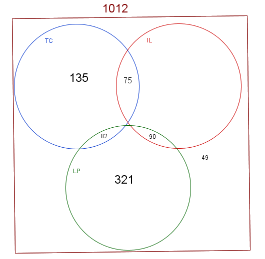 El curso de Pensamiento Lógico y Matemático es un curso cuyas temáticas no son desconocidas para los estudiantes, ya que en los estudios de bachillerato se abordan de manera nocional dichos conceptos. El Director de Curso realiza un diagnóstico con los 1012 estudiantes del periodo Intersemestral para determinar la cantidad de estudiantes que poseen nociones de alguna de las tres temáticas del curso. Es así que, se obtienen los siguientes resultados: 135 estudiantes sólo conocen de Teoría de Conjuntos; 321 no poseen nociones ni de Teoría de Conjuntos, ni de Inferencia Lógica, pero sí del otro tema; ninguno afirmó poseer nociones de los tres temas a la vez; 75 evidenciaron poseer únicamente nociones de Teoría de Conjuntos y de Inferencia Lógica; 82 dicen tener nociones de Lógica Proposicional y Teoría de Conjuntos solamente; 90 estudiantes expresaron no recordar el tema de Teoría de Conjuntos, pero sí de los otros dos temas; y 49 de los estudiantes no contestaron las preguntas del diagnóstico. ¿Cuántos estudiantes poseen nociones sólo de Inferencia Lógica? ¿Cuántos estudiantes en total poseen alguna noción de Inferencia Lógica?