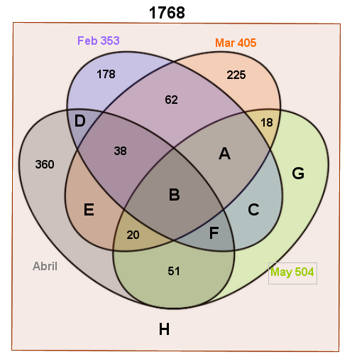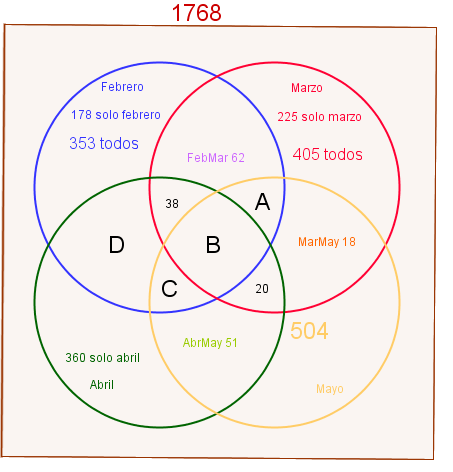 El primer periodo de 16 semanas del año 2015 reportó un total de 1768 estudiantes en el Curso de Pensamiento Lógico y Matemático. En la primera semana del mes de Junio se realizó un análisis de la cantidad de estudiantes que ingresaron a ver el video: “Explora tu Campus” que se encuentra en el link: https://www.youtube.com/watch?v=jem3pfYoRO0, durante los meses de Febrero, Marzo, Abril y Mayo. Para lo cual se generaron los siguientes datos: el total de estudiantes que ingresaron a ver el video en el mes de Febrero fue de 353, en el mes de Marzo ingresaron un total de 405 estudiantes, en el mes de Mayo 504 estudiantes en total ingresaron a ver el video;178 estudiantes sólo ingresaron en el mes de Febrero; 38 estudiantes ingresaron una vez por mes en los meses de Febrero, Marzo y Abril; 62 de los estudiantes ingresaron dos veces a ver el video, una vez en Febrero y repitieron en el mes de Marzo; 225 estudiantes sólo ingresaron en el mes de Marzo; 360 estudiantes sólo ingresaron en el mes de Abril; 18 de los estudiantes vieron el video por primera vez en el mes de Marzo y lo volvieron a ver en el mes de Mayo; 51 estudiantes ingresaron al link del video por primera vez en el mes de Abril y volvieron a ingresar en el mes de Mayo; 20 de los estudiantes ingresaron a ver el video en el mes de Marzo, volvieron a ingresar en el mes de Abril y por última vez lo vieron en el mes de Mayo. Dar respuesta a las siguientes preguntas: