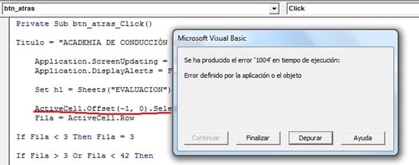 Al retroceder y continuar el retroceso, y luego de llegar a la fila 1, lógicamente me genera el siguiente error que me marca el la linea "ActiveCell.Offset(-1, 0).Select":