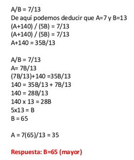 Dos números son entre si como 7 es a 13. Si al menor se le suma 140, el valor del otro numero debe multiplicarse por 5 para que el valor de la razón no se altere. Halle el mayor de los dos números