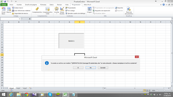 Sub GrabarenRed() ' ActiveWorkbook.SaveAs Filename:="\\DERMATOLOGA1\manager\PruebaGraba.xlsx", _ FileFormat:=xlOpenXMLWorkbook, CreateBackup:=False End Sub