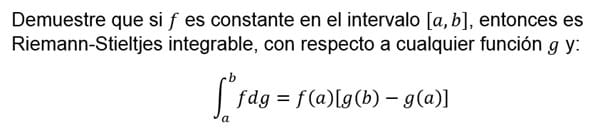 Demuestra que si f es constante en el intervalo [a,b], entonces es Riemann-Stieltjes integrable con respecto a cualquier función g: