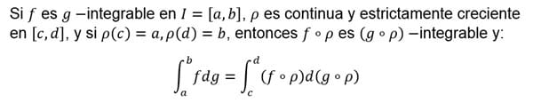Demostrar que si f es g-integrable en I=[a,b] rho es continua y esctrictamente creciente en [c.d] y si rho(c)=a rho(d)=b entonces ( f o rho) es (g o rho)-integrable y se cumple la integral: