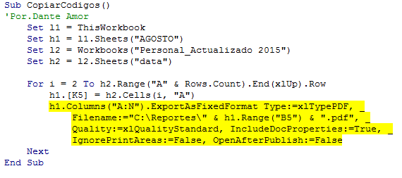 Que tal Dante buenos días te comento: la macro lo que hace es crear un pdf con el nombre del empleado y enviarlo a una ubicación que yo le indico, la macro esta en un modulo y le asigne un botón, el código de cada persona lo ingreso manual, y tarda unos segundos en cargar la información, hasta aquí todo bien, sin embargo se hace un poco tedioso ingresar uno a uno los códigos esperar a que cargue los datos y luego presionar el botón para que genere y guarde el pdf, de acá viene mi solicitud, en otro archivo tengo el listado de códigos, y lo que me gustaría hacer es que esos códigos se copien automáticamente (el orden no importa), al archivo del formato, esperar que carguen los datos, que se ejecute la macro que crea el pdf y lo guarda y luego copie el siguiente código y así sucesivamente hasta que se generen todo los reportes. esta es la macro que utilizo: