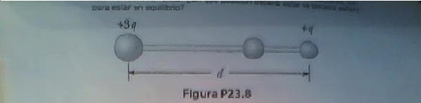 Primero: Dos esferas pequeñas con cargas positivas 3q y que están fijas en loss extremos de una varilla aislante horizontal, que se extiende desde el origen hasta el punto x=d. Como se puede observar en la figura P23.8, existe una tercera esfera pequeña con carga que puede deslizarse con libertad sobre la varilla. ¿En qué posición deberá estar la tercera esfera para estar en equilibrio?