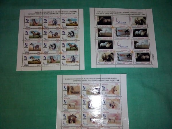 2 sellos de correos de 20,35,70,100,150 y 185 pesetas Exposicion Mundial De Filatelia España 2000-caballos cartujanos 1998 . 2 sellos de correos de 20,35,70,100,150 y 185 pesetas Exposicion Mundial De Filatelia España 2000-caballos cartujanos, logotipo y cartel anunciador-1999.2 sellos de correos de 20,35,70,100,150 y 185 pesetas Exposicion Mundial De Filatelia España 2000-caballos cartujanos -2000. Cual es su valor