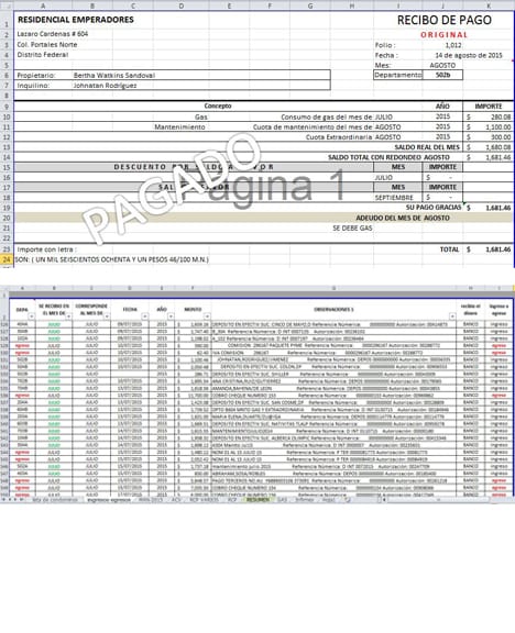 En la hoja "ingresos-egresos" capturo los depósitos en diferentes columnas desde la A a la I, desde la fila 2 hasta que acabe el año, esto es por mes y departamento, en la hoja "RCP" genero los recibos de pago de acuerdo a los datos de la hoja "ingresos-egresos".