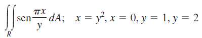 $$\begin{align}&\int_1^2\int_0^{y^2}sen \frac{\pi x}{y}dx\,dy=\\&\\&\text{efectuamos la de dentro}\\&\\&\int_1^2-\frac {y}{\pi}\cos \frac{\pi x}{y}\bigg|_0^{y^2}dy=\\&\\&\int_1^2-\frac {y}{\pi}\left(\cos \pi y-\cos \frac 0y\right)dy=\\&\\&\text{tengamos en cuenta que y no valdrá 0, vale entre 1 y 2}\\&\\&\int_1^2-\frac {y}{\pi}\left(\cos \pi y-1\right)dy=\int_1^2 \frac {y}{\pi}\left(1-\cos \pi y\right)dy=\\&\\&u=\frac y\pi\qquad\qquad\qquad du =\frac{dy}{\pi}\\&dv=(1-\cos \pi y)dy\qquad v=y-\frac{sen\, \pi y}{\pi}\\&\\&=\left[\frac y \pi\left(y-\frac{sen \pi y}{\pi}  \right)  \right]_1^2-\int_1^2\left(\frac y\pi-\frac{sen\, \pi y}{\pi^2} \right)dy=\\&\\&\frac 2{\pi}\left(2-\frac{sen\,2\pi}{\pi}  \right)-\frac 1{\pi}\left(1-\frac{sen\,\pi}{\pi}  \right)-\left[\frac{y^2}{2\pi}+\frac{\cos \pi y}{\pi^3} \right]_1^2=\\&\\&\frac 4\pi-\frac 1\pi-\frac{2}{\pi}-\frac{\cos 2\pi}{\pi^3}+\frac{1}{2\pi}+\frac{\cos\pi}{\pi^3}=\\&\\&\frac 4\pi-\frac 1\pi-\frac{2}{\pi}-\frac{1}{\pi^3}+\frac{1}{2\pi}-\frac{1}{\pi^3}=\\&\\&\frac{8-2-4+1}{2\pi}-\frac{2}{\pi^3}=\\&\\&\frac{3}{2\pi}-\frac{2}{\pi^3}=\frac{3\pi^2-4}{2\pi^3}\end{align}$$Saludos.