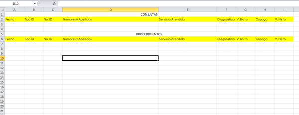 A:Fecha B:Tipo ID C:Numero ID D:Nombres y Apellidos E:Servicio Atendido F:Diagnóstico G:V. Bruto H:Copago I:V. Neto
