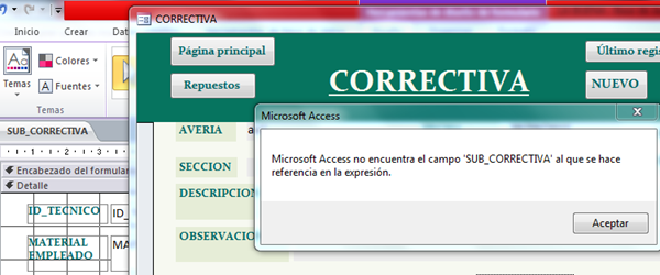 Anita: Por la captura de pantalla no me parece que SUB_CORRECTIVA sea un SubFormulario que esté dentro de del Formulario CORRECTIVA, de éste modo es lógico que te de error porque la línea: