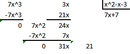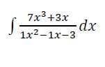 $$\begin{align}&I=\int \frac{7x^3+3x}{x^2-x-3}dx=\\&\\&\int \left(7x+7+\frac{31x+21}{x^2-x-3}\right)dx=\\&\\&\frac{7x^2}{2}+7x+\int \frac{31x+21}{x^2-x-3}dx=\\&\\&\text{Hay que hallar las raíces del denominador}\\&\\&x=\frac{1\pm \sqrt{1+12}}{2}=\frac{1\pm \sqrt{13}}{2}\\&\\&\text{hay que descomponer en fracciones simples}\\&\\&\frac{31x+21}{x^2-x-3}=\frac{a}{x-\frac{1+ \sqrt{13}}{2}}+\frac {b}{x-\frac{1- \sqrt{13}}{2}}=\\&\\&\frac{(a+b)x-\frac {a+b}2+\frac{(a-b)\sqrt{13}}{2}}{x^2-x-3}\\&\\&luego\\&\\&a+b=31 \implies a=31-b\\&\\&-\frac {a+b}2+\frac{(a-b)\sqrt{13}}{2}=21\\&\\&-(a+b)+(a-b) \sqrt{ 13}=42\\&\\&-31+(31-b-b) \sqrt {13}=42\\&\\&(31-2b)\sqrt {13}=73\\&\\&31-2b=\frac{73}{\sqrt {13}}=\frac{73 \sqrt {13}}{13}\\&\\&2b=31 -\frac{73 \sqrt {13}}{13}=\frac{403+73 \sqrt {13}}{13}\\&\\&b=\frac{403-73 \sqrt {13}}{26}\\&\\&a=31-\frac{403-73 \sqrt {13}}{26}=\frac{403+73 \sqrt {13}}{26}\\&\\&I=\frac{7x^2}{2}+7x+\frac{403+73 \sqrt {13}}{26}\int \frac{dx}{x-\frac{1+ \sqrt{13}}{2}}+\frac{403-73 \sqrt {13}}{26}\int \frac{dx}{x-\frac{1- \sqrt{13}}{2}}=\\&\\&\frac{7x^2}{2}-7x+\frac{403+73 \sqrt {13}}{26}ln \bigg|x-\frac{1+ \sqrt{13}}{2}\bigg|+\frac{403-73 \sqrt {13}}{26}ln \bigg|x-\frac{1- \sqrt{13}}{2}\bigg|+C=\\&\\&\text{los ln2 que van a quedar son constantes que se meten en C}\\&\\&\frac{7x^2}{2}-7x+\frac{403+73 \sqrt {13}}{26}ln \bigg|2x-1- \sqrt{13}\bigg|+\frac{403-73 \sqrt {13}}{26}ln \bigg|2x-1+ \sqrt{13}\bigg|+C\\&\end{align}$$