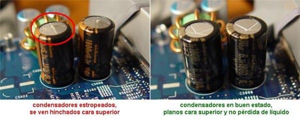 Observando la placa base, tambien podemos ver si la placa tuviera condensadores en mal estado (se suelen abombar por la parte superior),