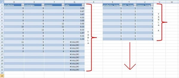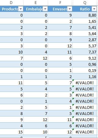 Así pues, no entiendo dónde está el error, llevo varios días investigando y probando cosas. Incluso he rehecho la tabla en otras hojas. Y sigue igual: en las celdas que "el excel quiere", me devuelve error #¡VALOR!