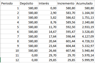 Un padre de familia debe tener ahorrado a final de año la suma de $6,000.000 para pagar la matrícula de su hijo en enero. Si solo puede realizar depósitos los primeros 10 meses del año en un fondo que paga un interés efectivo mensual del 0.5%. A) ¿Cuál será el valor de los depósitos mensuales, considerando que estos son iguales y b) elaborar la tabla de capitalización para el ahorro propuesto.