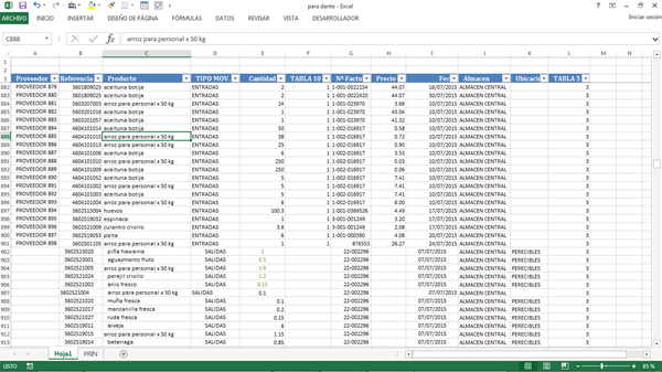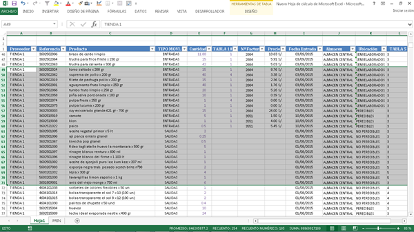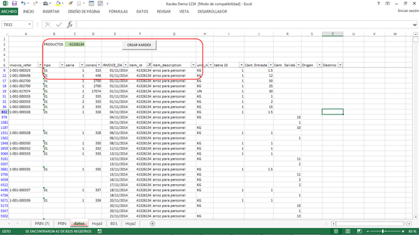 como puede ver hay una celda de color verde hay pego el código del producto de hay un botón que ejecuta la macro en la cual todos estos datos los pega en una hoja creada con el nombre del producto acá las entradas y las salidas están separadas en columnas diferentes es como lo estoy trabajando actualmente