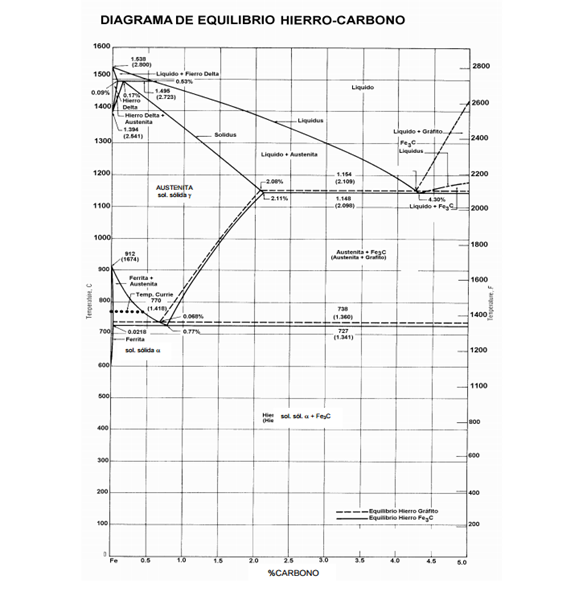 a) Ferrita: en la gráfica es la fase comprendida entre 0% a 0.022% de carbono en el rango de ~600 °C a 912°CC