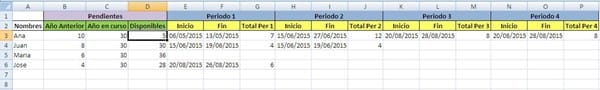 Tal vez alguien me pueda ayudar a configurar mi tabla de excel para calcular los días de vacaciones que le van quedando a los trabajadores a lo largo del año. Tan solo tendría que haber una columna inicial con los días de vacaciones pendientes del año anterior (total de días al año son 30). En esta primera columna se pondrían los días que le queden a cada persona y serían los primeros que se deben restar hasta llegar a 0 desde que la persona comience a disfrutar vacaciones en el año. En otra columna final con los días pendientes de vacaciones del año en curso (esto siempre es 30 (el máximo de días posibles), y en medio, las columnas que conforman hasta cuatro períodos en los que se pueden dividir los 30 días de vacaciones. En cada período una columna con la fecha inicial, otra con la final y otra con el total de días. Como digo, repetidas en cuatro períodos, por si el trabajador distribuye sus vacaciones a lo largo del año en una, dos, tres o cuatro veces. Y que los días pendientes se vayan restando hasta 0 del total de días que vaya disfrutando... No sé cómo lo ven, es posible...