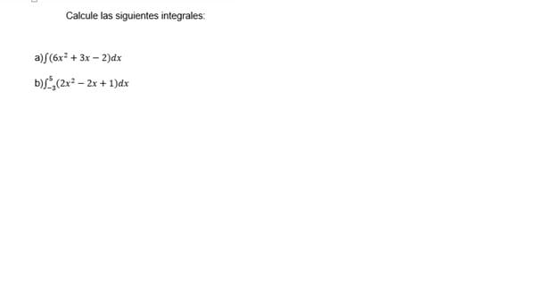 $$\begin{align}&\text{Debes usar esta fórmula}\\&\int x^n dx = \frac{x^{n+1}}{n+1}\quad si\; n\neq-1\\&\text{al margen de las consabidas propiedades de la}\\&\text{suma de integrales y el producto por una constante}\\&\\&\\&a)\int(6x^2+3x-2)dx=\\&\\&6\int x^2 dx+ 3\int x\,dx -2\int dx=\\&\\&\text{considera }dx = 1·dx=x^0dx\\&\\&=6·\frac{x^{2+1}}{2+1}+ 3·\frac{x^{1+1}}{1+1}-2·\frac{x^{0+1}}{0-1}+C=\\&\\&2x^3+\frac 32x^2-2x + C\\&\\&\\&\\&b)\\&\int_{-3}^5(2x^2-2x+1)dx =\\&\\&\left[\frac 23x^3-x^2+x \right]_{-3}^5=\\&\\&\frac 23·125 - 25+5 - \frac 23(-3)^3+(-3)^2-(-3)=\\&\\&\frac{250}3-20+18+9+3 = \\&\\&\frac{250}3+10= \frac {250+30}{3}=\frac {280}{3}\end{align}$$: