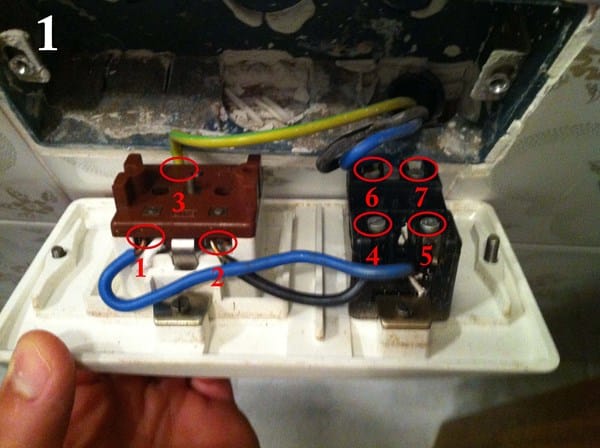 Hola, mi problema es que quiero sustituir el enchufe de la foto 1 por el de la foto 2, las tomas 1,2,3 de la foto1 son para el enchufe, y la 4,5,6,7 para el fusible, lleva dos fusibles antiguos de los cerámicos con el hilo por fuera.