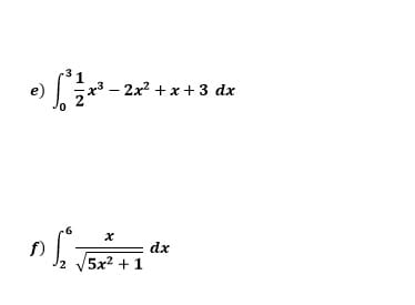 $$\begin{align}&\int_0^3 \left(\frac 12 x^3 - 2x^2 + x + 3\right) dx=\\&\\&=\left[\frac 12·\frac{x^4}{4}-2·\frac{x^3}{3}+\frac {x^2}2+3x \right]_0^3=\\&\\&\frac{81}{8}-18+\frac 92+9-0+0-0-0=\\&\\&\frac{81+36}{8}-9=\frac{117-72}{8}=\frac {45}8\\&\\&\\&----------------\\&\\&\\&\int_2^6 \frac{x\,dx}{\sqrt{5x^2+1}} =\\&\\&t=5x^2+1\\&dt=10x\,dx\implies x\,dx=\frac{1}{10}dt\\&x=2\implies t=5·2^2+1=21\\&x=6\implies t=5·6^2+1=181\\&\\&=\int_{21}^{181}\frac 1{10}·\frac{1}{\sqrt t}dt=\\&\\&\frac 1{10}\int_{21}^{181}t^{-\frac 12}dt=\\&\\&\left.\frac 1{10} \frac{t^{\frac 12}}{\frac 12} \right|_{21}^{181}=\left.\frac{\sqrt t}{5}\right|_{21}^{181}=\frac{\sqrt{181}-\sqrt{21}}{5}\end{align}$$: