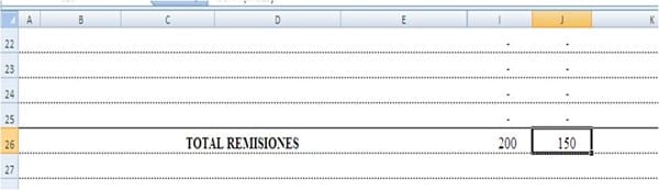 Columna I,26 (Formula): =SUMA(I4:I25)